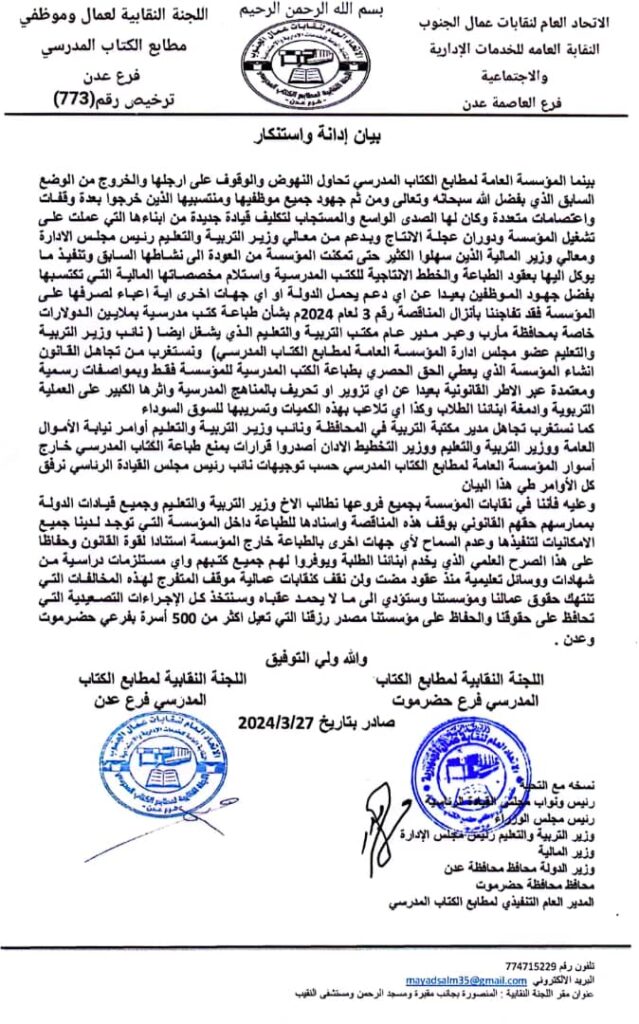 اللجان النقابية في مطابع الكتاب المدرسي تدين وتستنكر السلطة المحلية ومكتب تربية مأرب