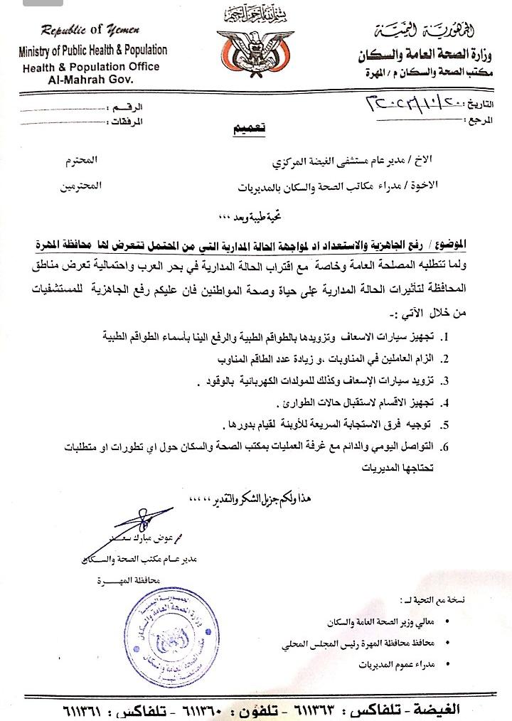تعميم محافظة المهرة لمواجهة الحاله المدارية في بحر العرب