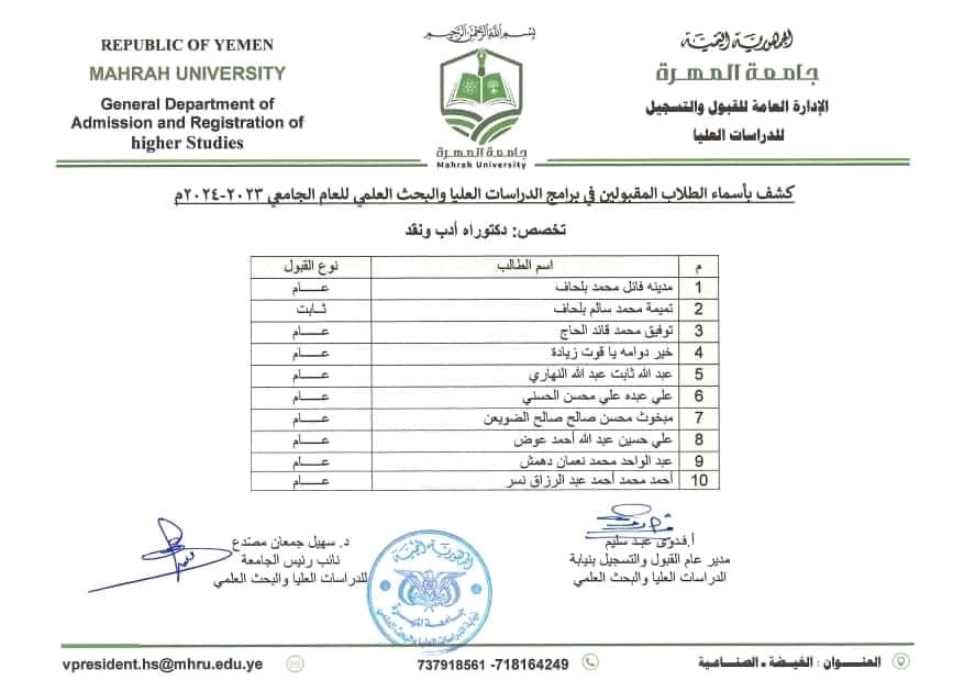 جامعة المهرة تعلن أسماء الطلاب المقبولين في برامج الدراسات العليا