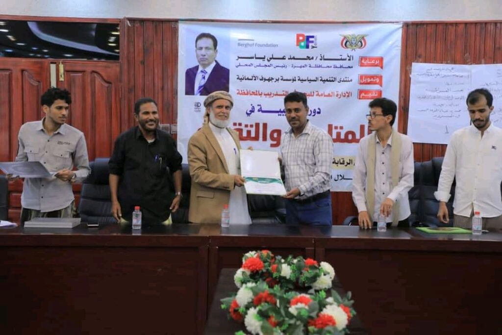 إدارة البحوث والتدريب بالمهرة تختتم دورة المتابعة والتقييم ل25 من موظفي الرقابة والإدارات الحكومية