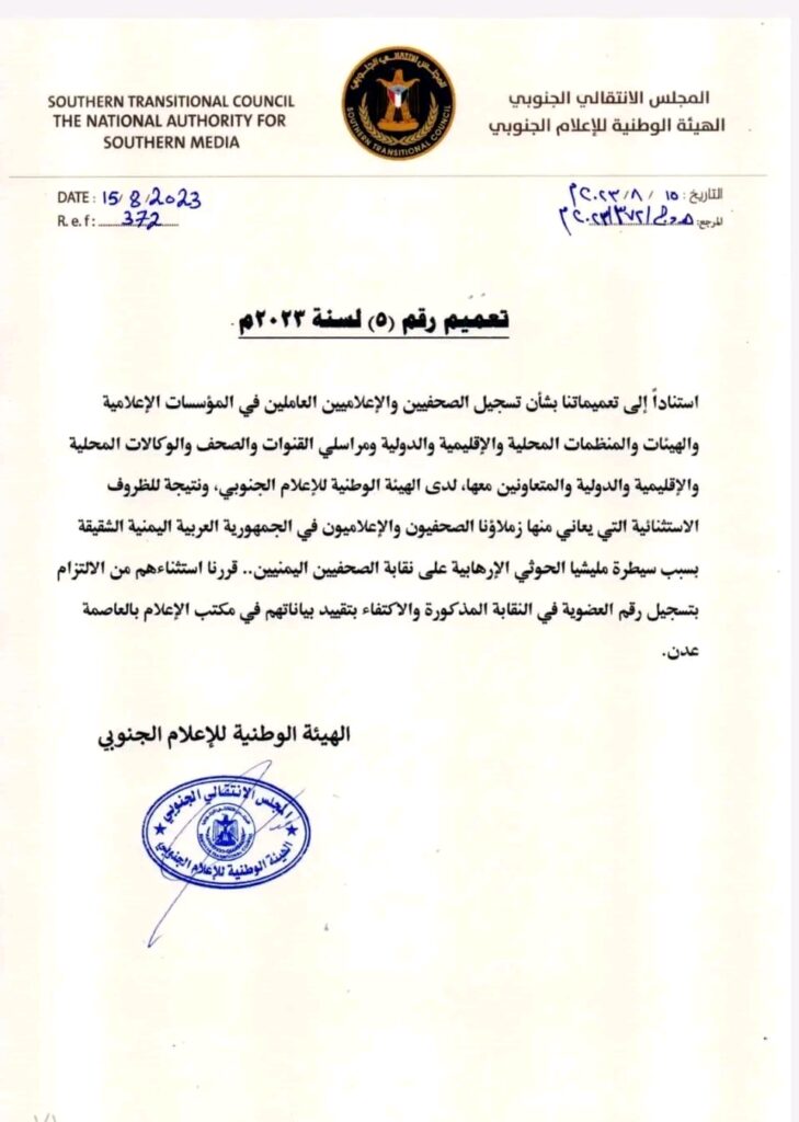 الهيئة الوطنية للإعلام الجنوبي تصدر تعميما خاصا بشأن تنظيم عمل الصحفيين والإعلاميين القادمين من شمال اليمن