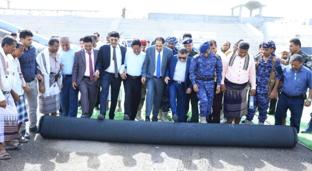 الوزير البكري يدشن فرش ملعب الشهداء في أبين ويعلن رفع مخصصات أنديتها
