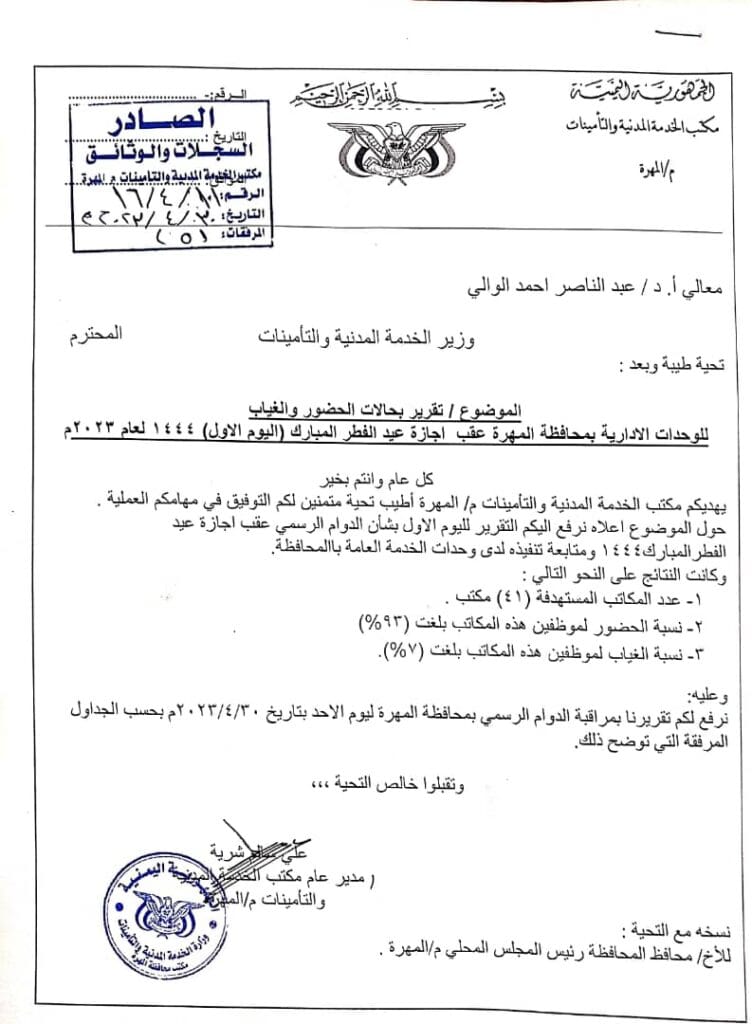 93 % نسبة حضور الموظفين في أول يوم دوام بعد انتهاء إجازة عيد الفطر في محافطة المهرة
