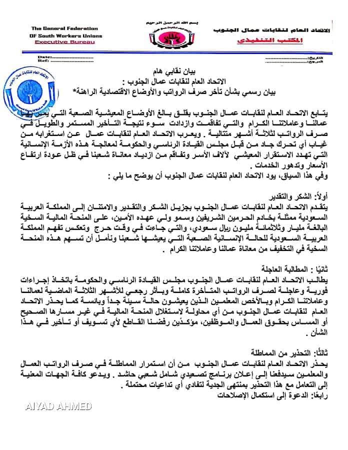 الاتحاد العام لنقابات عمال الجنوب يحذر من تصعيد شامل بسبب تأخر صرف الرواتب