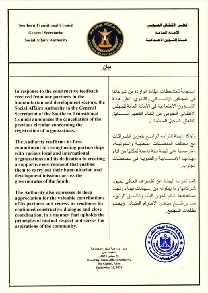 المجلس الانتقالي الجنوبي يعلن إلغاء التعميم الخاص بتسجيل المنظمات