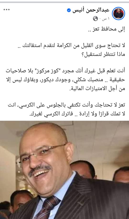 صحفي يمني بارز يطالب محافظ تعز بالاستقالة