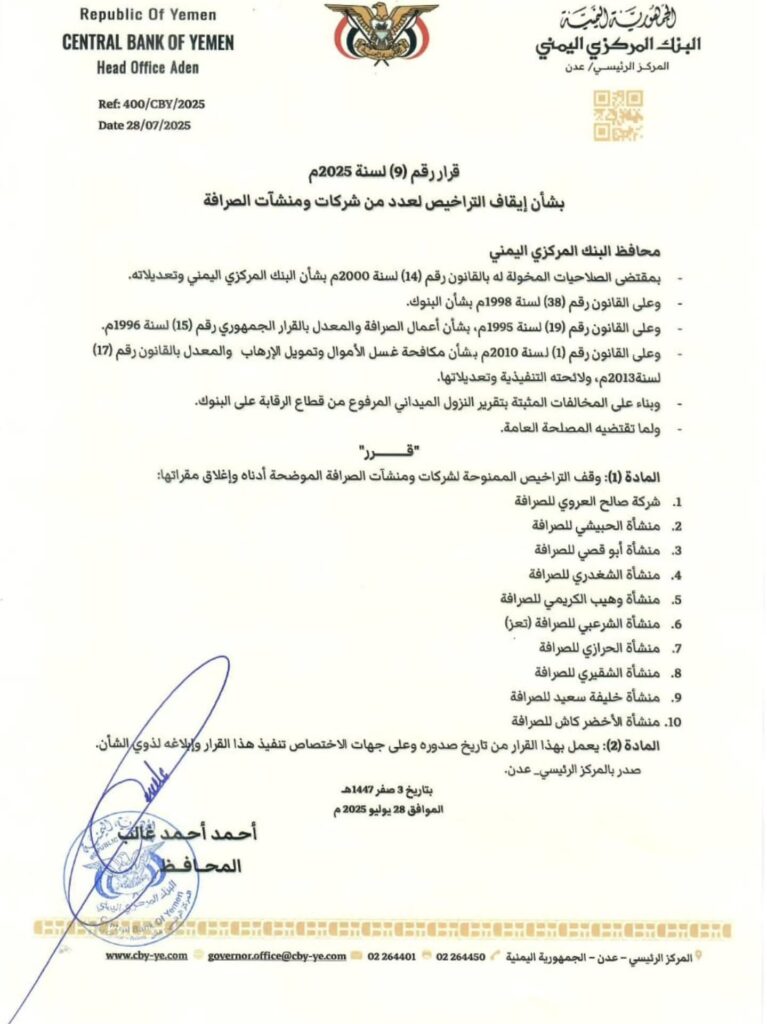 محافظ البنك المركزي يصدر قرار رقم 9 بشأن ايقاف تراخيص عدداً من شركات ومنشآت الصرافة