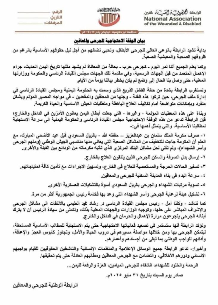 في وقفة احتجاجية بمأرب.. جرحى ومعاقو الجيش يشكون الإهمال ويتهمون الحكومة بالتقاعس