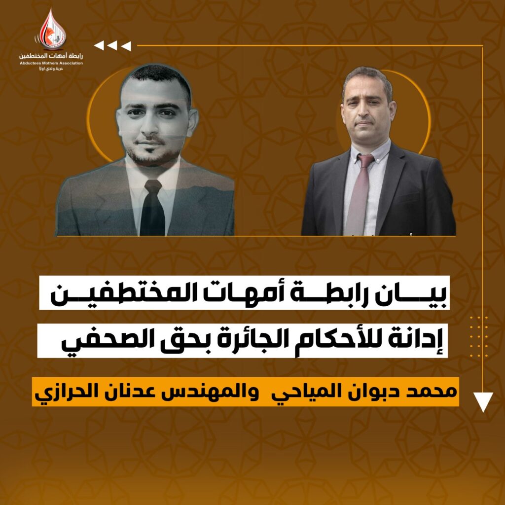 رابطة أمهات المختطفين تدين الأحكام الجائرة بحق الصحفي محمد المياحي والمهندس عدنان الحرازي