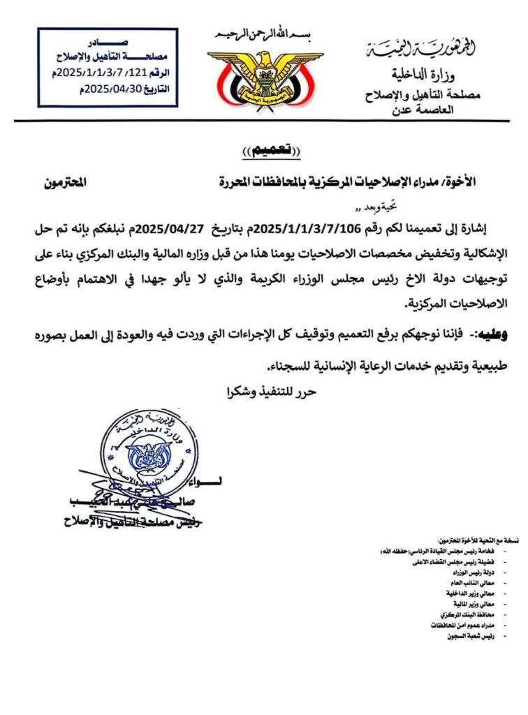 رئاسة مصلحة التأهيل والإصلاح تعلن حل إشكالية تخفيض مخصصات الإصلاحيات واستئناف العمل بشكل طبيعي