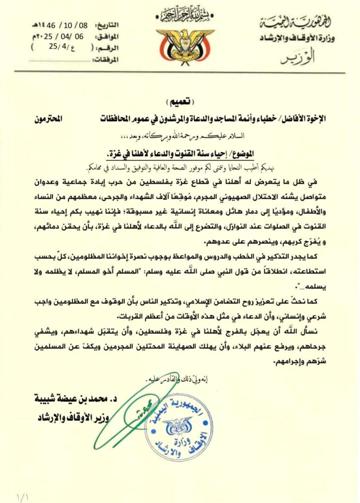وزارة الأوقاف والإرشاد تحث أئمة المساجد والدعاة إلى إحياء سنة القنوت والدعاء لأهلنا بغزة