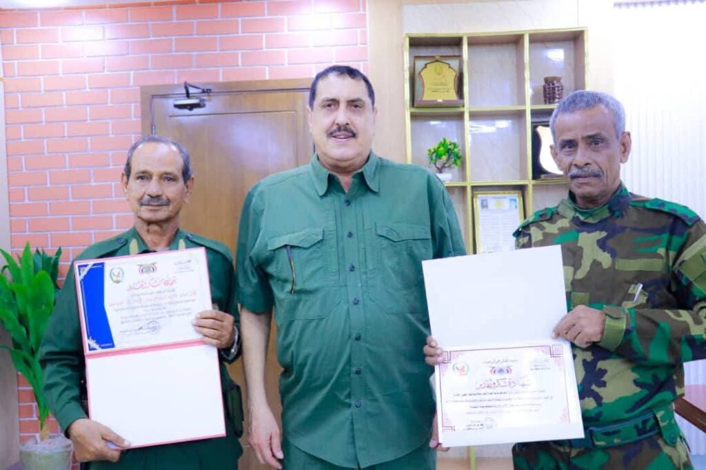مدير أمن العاصمة عدن يكرم ضابطين نظير تفانيهم بعملهم وإخلاصهم أثناء تنفيذ المهام