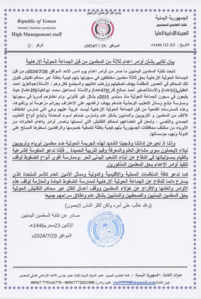 بيان نقابي بشأن أوامر اعدام ثلاثة من المعلمين من قبل الجماعة الحوثية الإرهابية