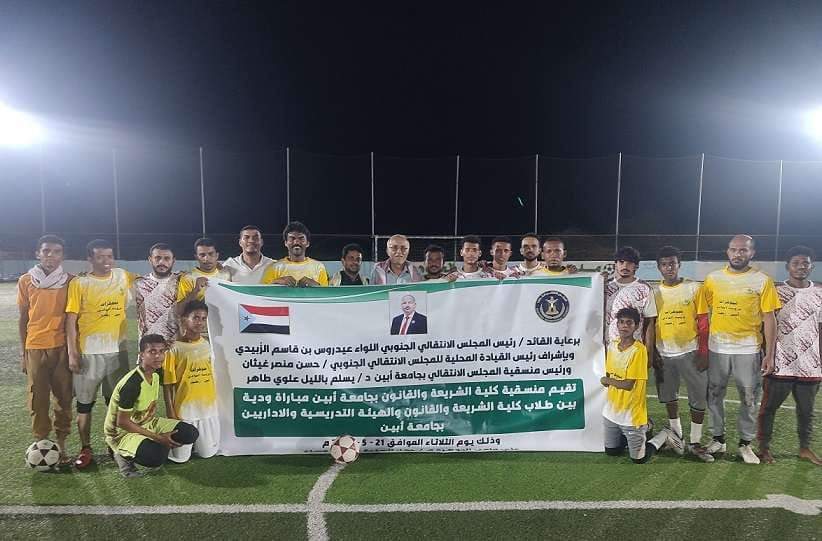 منسقية كلية الشريعة والقانون بجامعة أبين تنظم مباراة ودية بين فريقي طلاب الكلية والهيئة التدريسية والإدارية بالجامعة