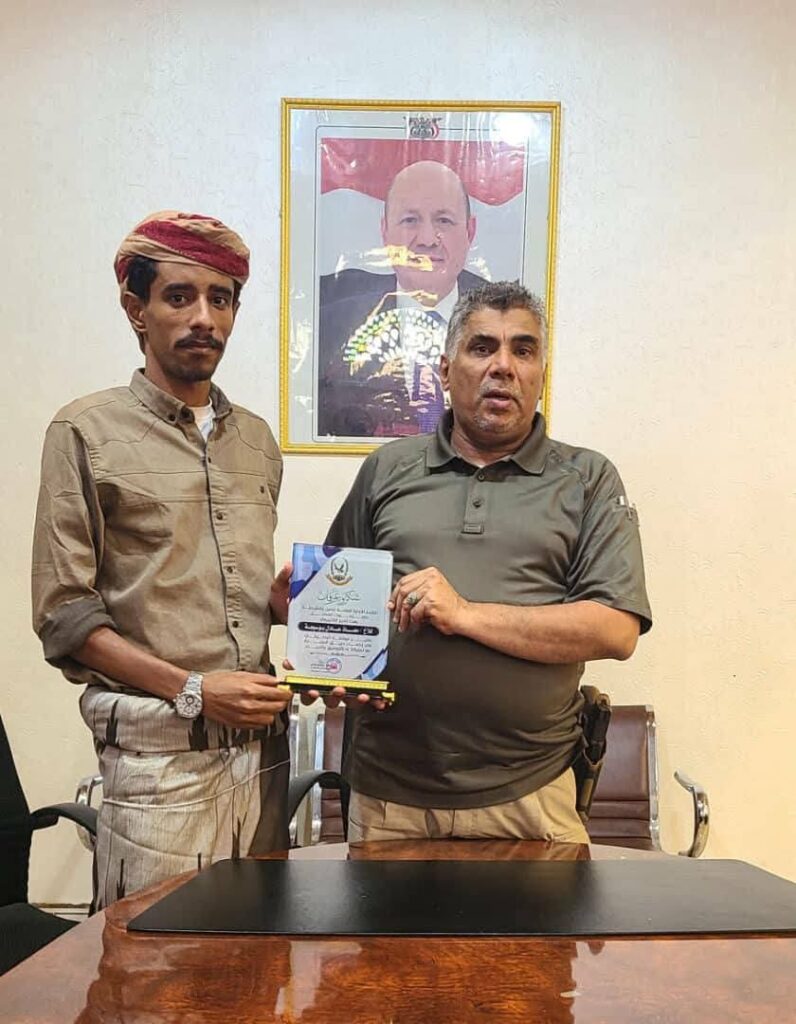 العميد المنهالي يكرّم الشاب معاذ بوسبعة تقديرًا لبطولته في إطفاء حريق اندلع بسيارة بالمكلا