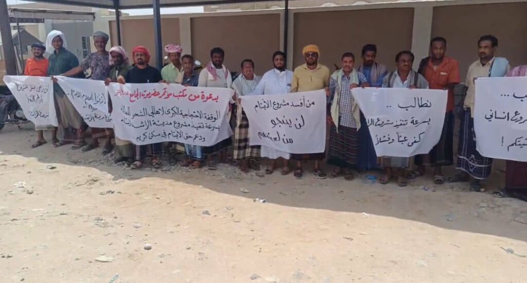 وقفة احتجاجية سلمية أمام مبنى الإدارة المحلية بالشحر للمطالبة بتنفيذ مشروع مدينة الراشد السكنية للأيتام
