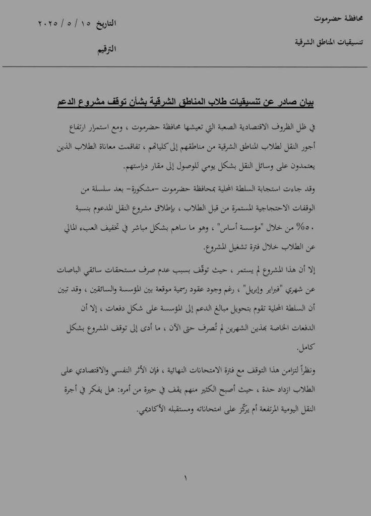 طلاب المناطق الشرقية بحضرموت يصدرون بياناً هاماً (وثيقة)