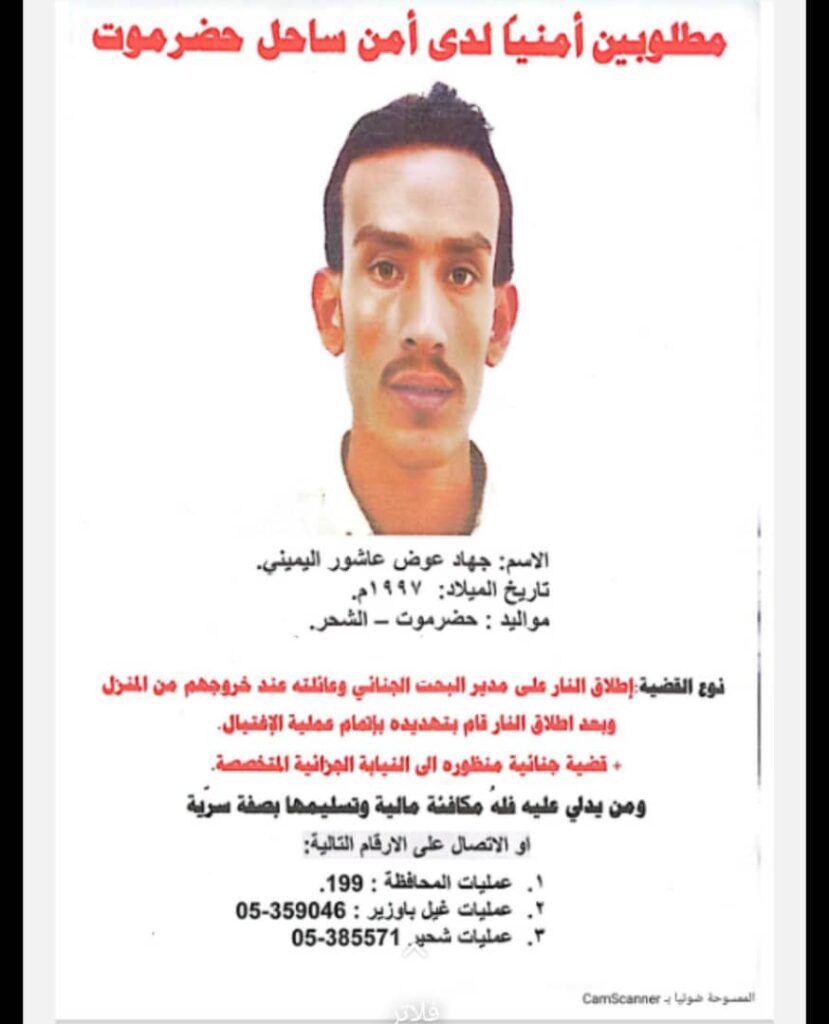 إدارة الأمن والشرطة بساحل حضرموت تصدر تعميم ضد مطلوب أمني وتؤكد مكافأة من يدلي بأي معلومة عنه