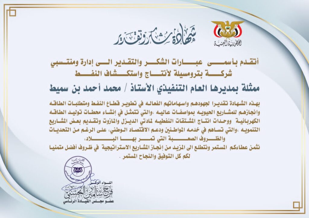 عضو مجلس القيادة الرئاسي البحسني يمنح شركة بترومسيلة شهادة تقدير