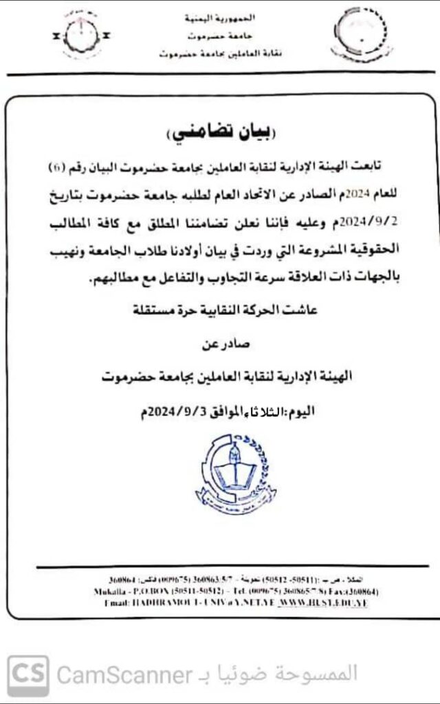 نقابة العاملين بجامعة حضرموت تتضامن مع مطالب الطلاب