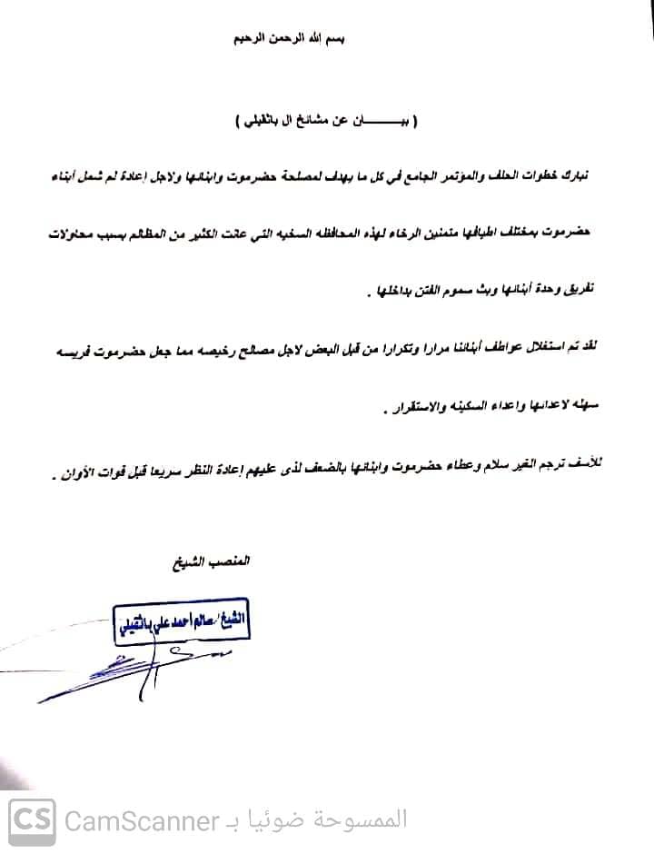 مشائخ قبيلة الـ «باثقيلي» يؤيدون خطوات حلف قبائل حضرموت ومؤتمر حضرموت الجامع