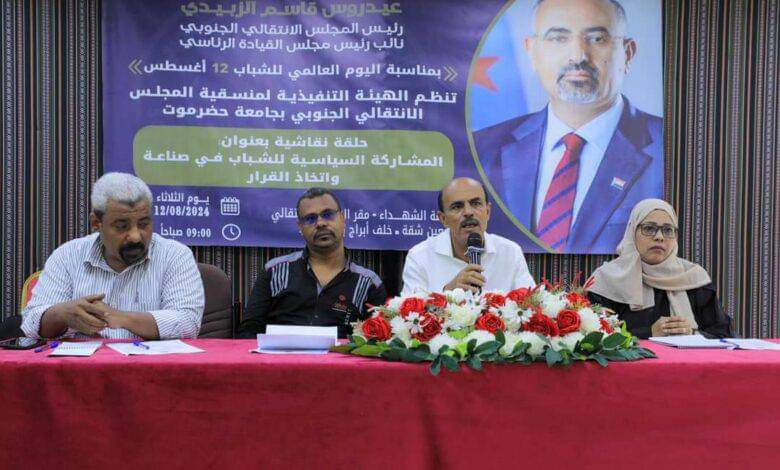 منسقية الانتقالي بجامعة حضرموت تنظم حلقة نقاشية بعنوان “المشاركة السياسية للشباب في صناعة واتخاذ القرار”