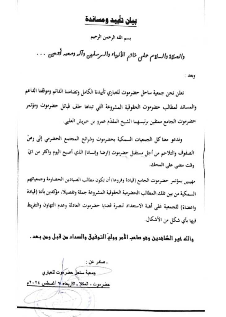 عاجل: حلف قبائل حضرموت يصدر توضيح هام