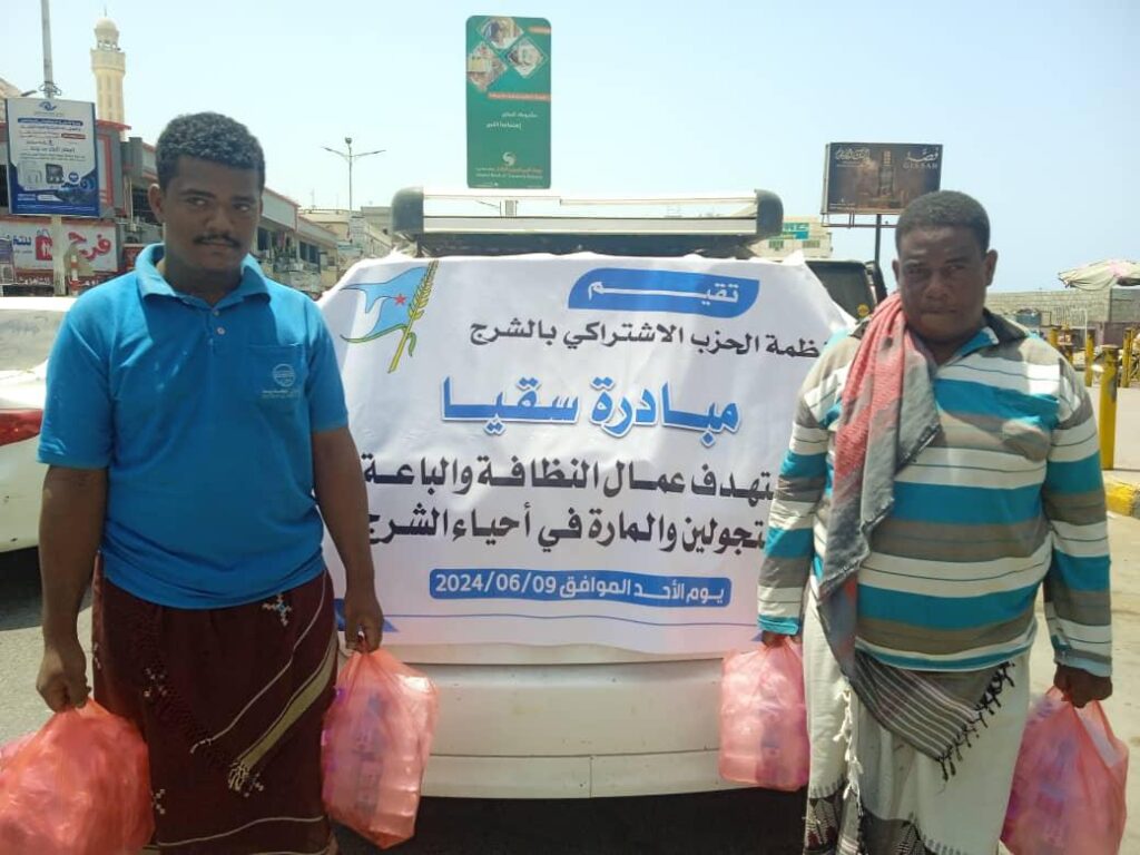 اشتراكي الشرج ينفذ مبادرة “سقيا” لتوفير الماء لعمال النظافة والباعة المتجولين والمارة بالمكلا