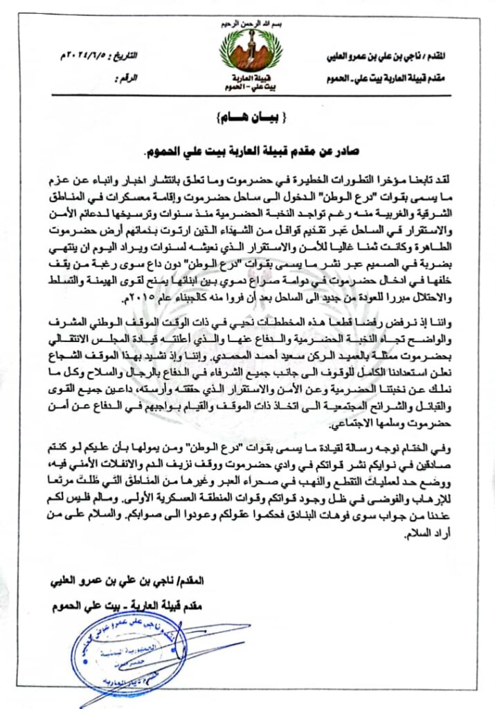 المقدم العليي الحمومي: نرفض أي محاولات لإدخال قوات عسكرية لا تنتمي للنخبة الحضرمية ومستعدون للدفاع عنها بالرجال والسلاح