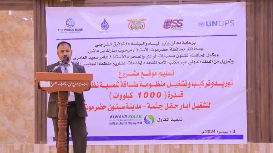 وكيل المحافظة يشهد تسليم مشروع توريد وتركيب وتشغيل منظومة طاقة شمسية لآبار حقل مياه جثمة بسيئون