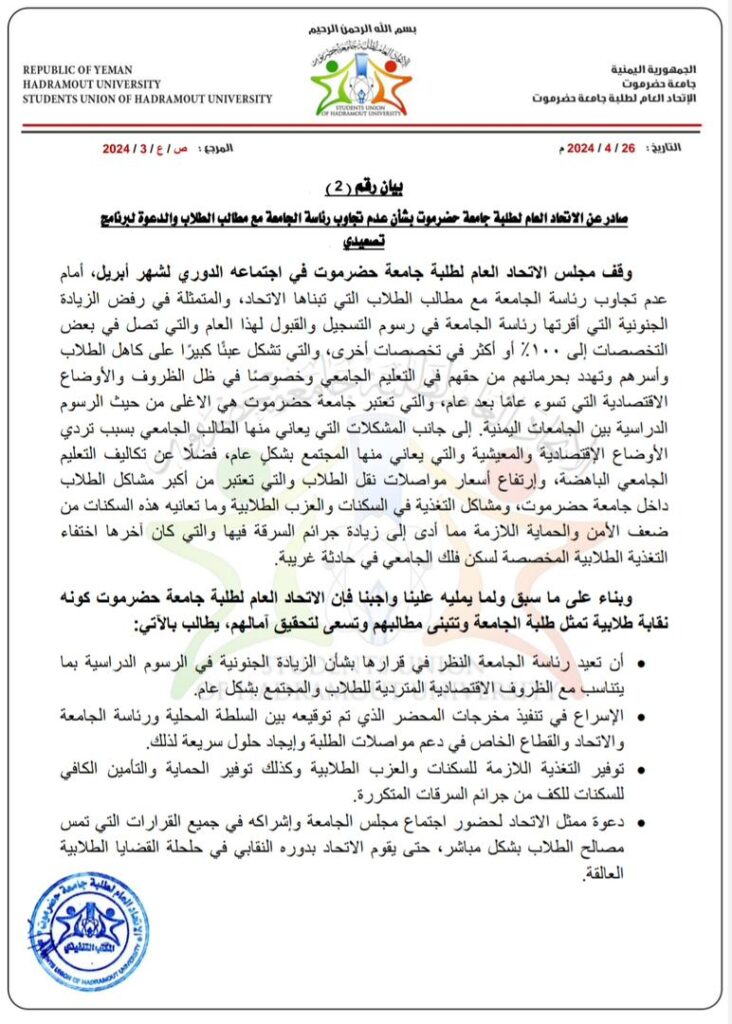 بيان رقم ( 2 ) صادر عن الاتحاد العام لطلبة جامعة حضرموت بشأن عدم تجاوب رئاسة الجامعة مع مطالب الطلاب والدعوة لبرنامج تصعيدي