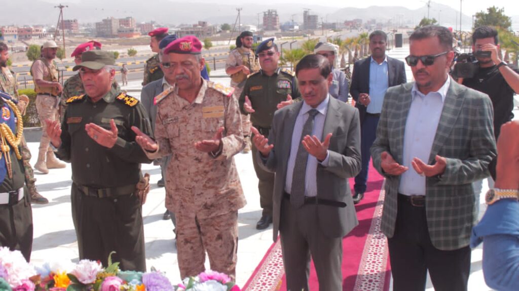 عضو مجلس القيادة الرئاسي البحسني وقائد المنطقة العسكرية الثانية يضعان إكليلاً من الورود على ضريح الجندي المجهول بالنصب التذكاري وساحة شهداء حضرموت