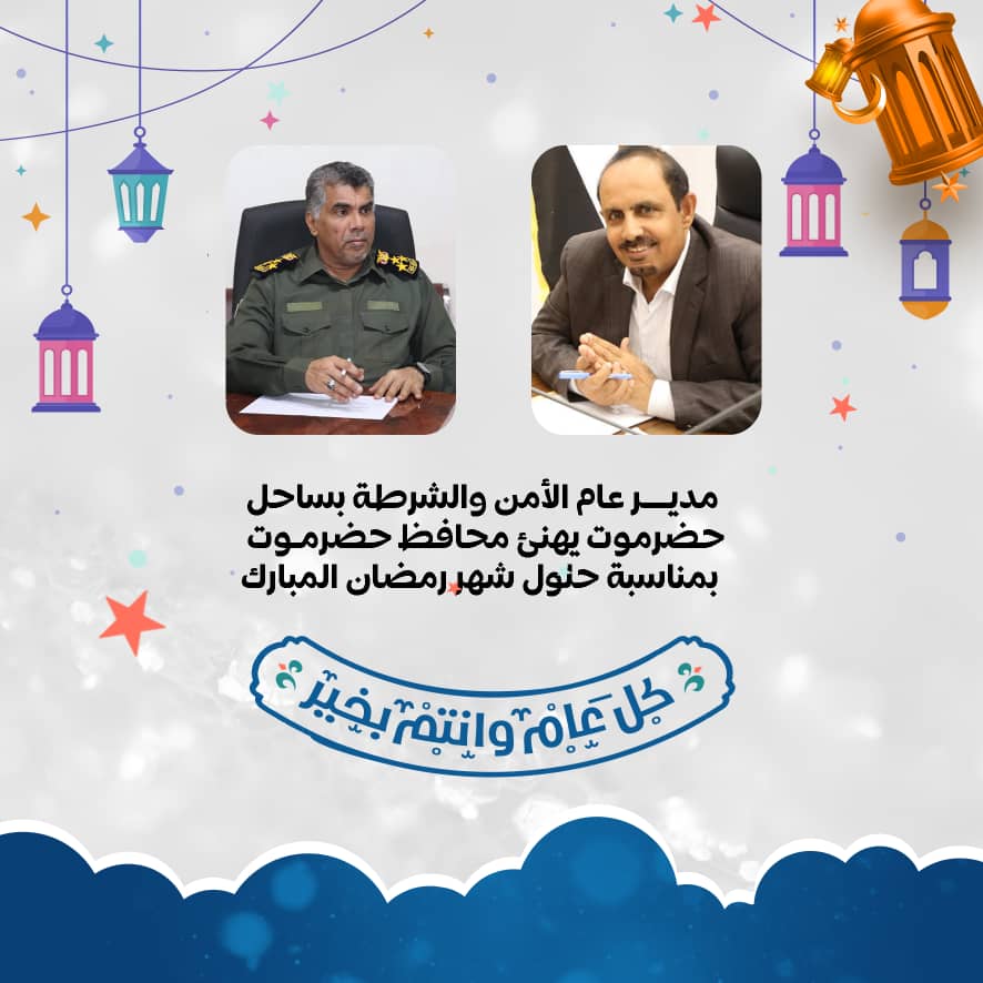 المدير العام لأمن وشرطة ساحل حضرموت يهنئ محافظ حضرموت بمناسبة حلول شهر رمضان المبارك
