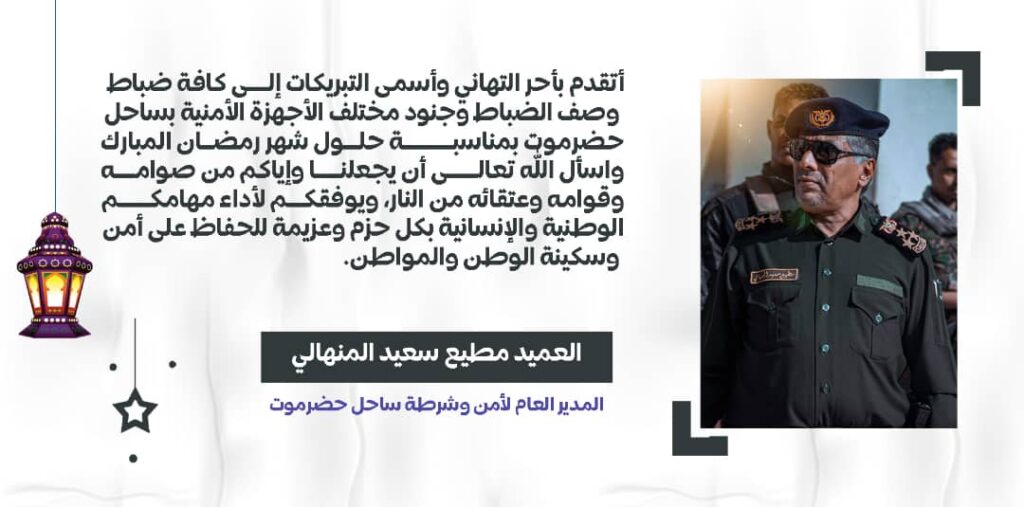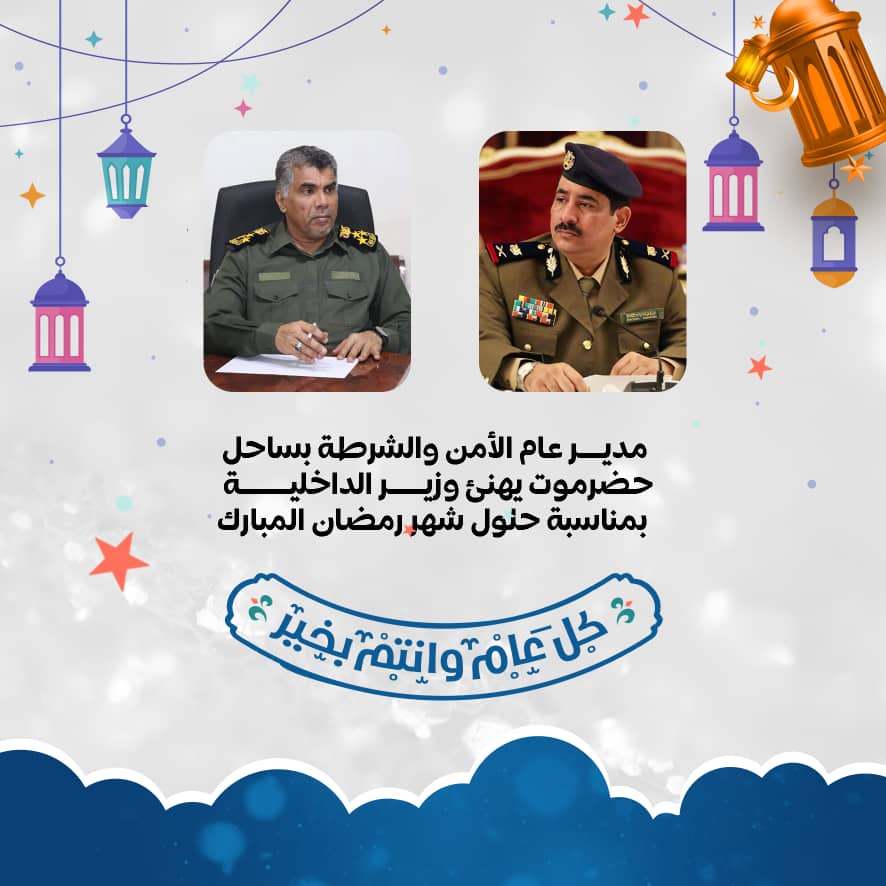 المدير العام لأمن وشرطة ساحل حضرموت يهنئ وزير الداخلية بمناسبة حلول شهر رمضان المبارك