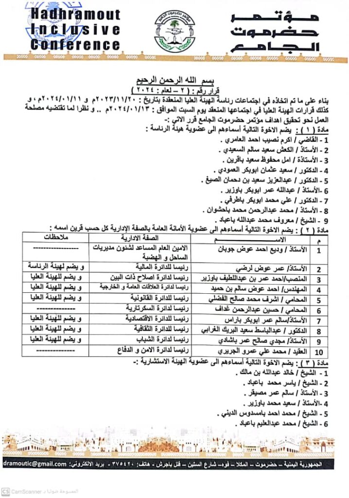صدور قرار لرئيس مؤتمر حضرموت الجامع بضم أعضاء لهيئة الرئاسة و الأمانة العامة , والهيئة الاستشارية وعددًا من إدارة مكاتب الهيئات التنفيذية في المديريات