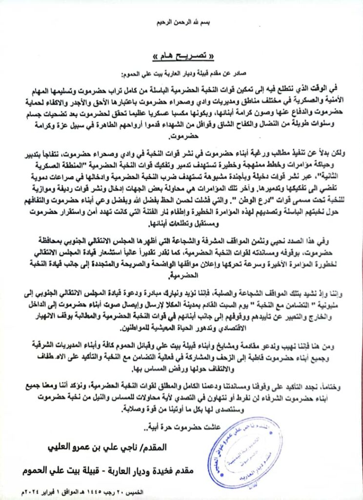 الشيخ العليي يؤكد رفضه المساس بقوات النخبة الحضرمية ويدعو أبناء حضرموت للمشاركة في فعالية التضامن مع النخبة