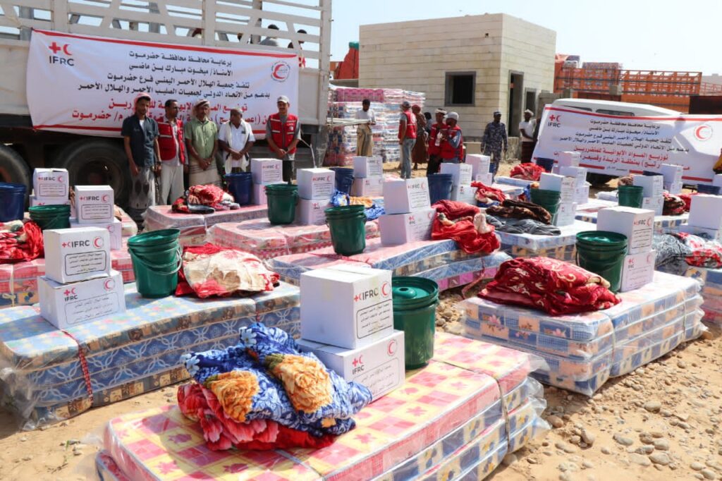 جمعية الهلال الأحمر اليمني فرع حضرموت توزع 447 سلة ايوائية للمتضررين من (إعصار تيج) بالمحافظة.