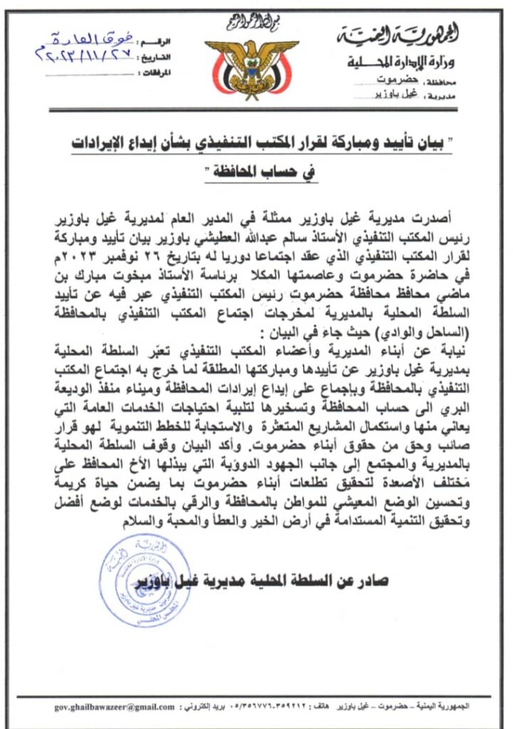 بيان صادر عن السلطة المحلية بمديرية غيل باوزير ومكتبها التنفيذي