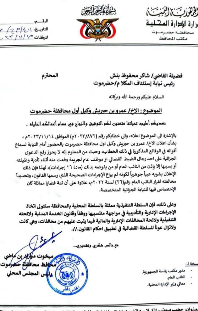 محافظ حضرموت يوجه بمذكرة إلى رئيس نيابة إستئناف حضرموت أكد خلالها ان مذكرة استدعاء بن حبريش مخالفة للقانون