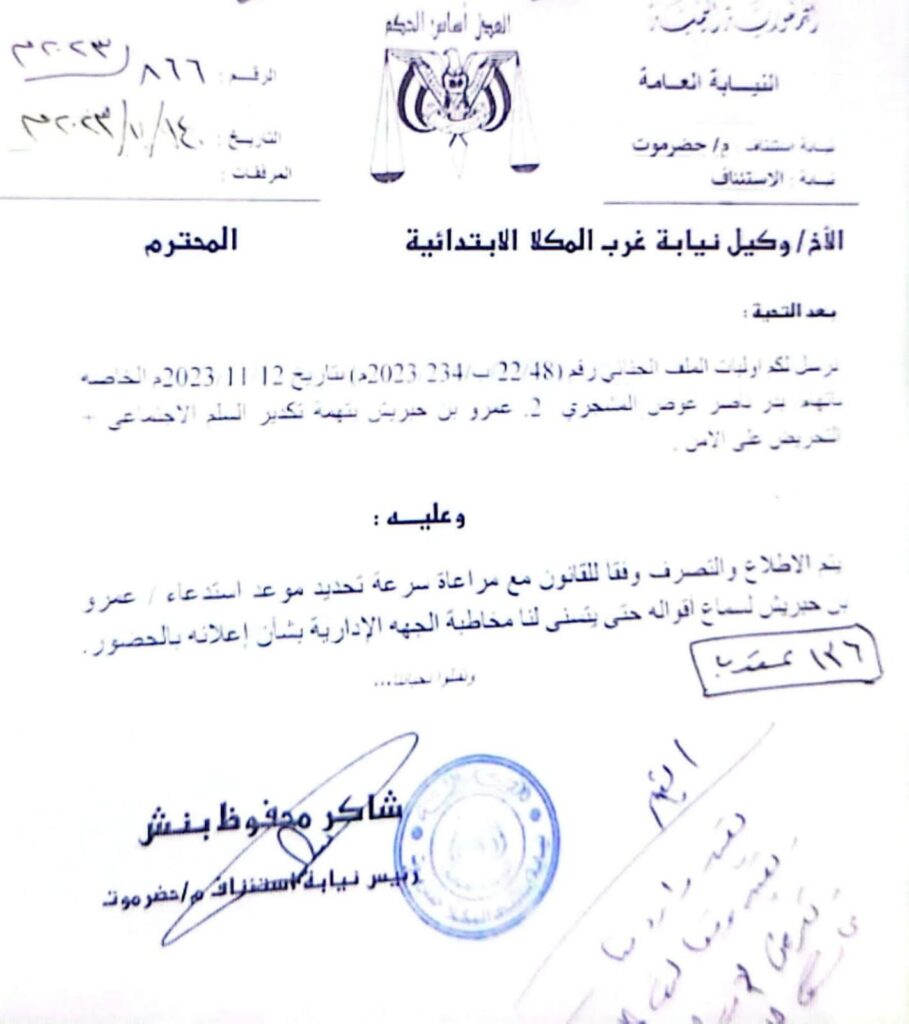 في سابقة خطيرة بحضرموت وبسبب مواقفه من الإمارات نيابة حضرموت توجه بالتحقيق مع المقدم عمرو بن حبريش