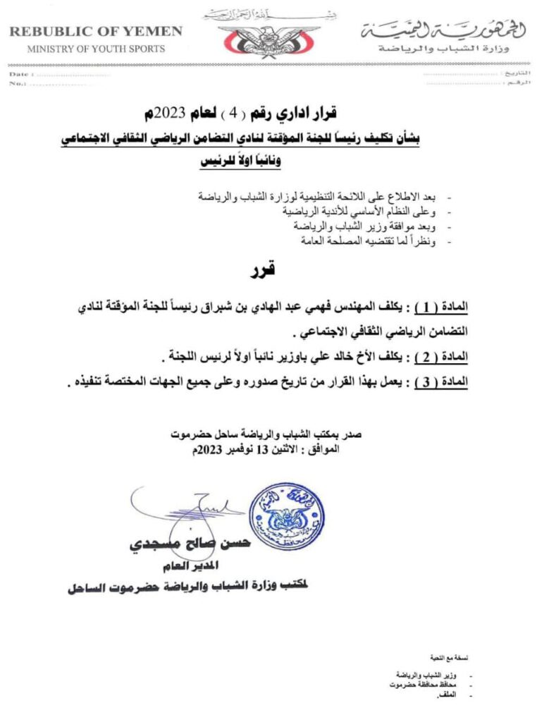 المهندس فهمي بن شبراق رئيسا لنادي التضامن الرياضي وخالد باوزير نائباً أول