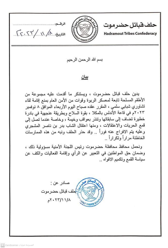 حلف قبائل حضرموت يدين قيام قوات عسكرية بمنع اقامة لقاء شبابي تشاوري بالمكلا