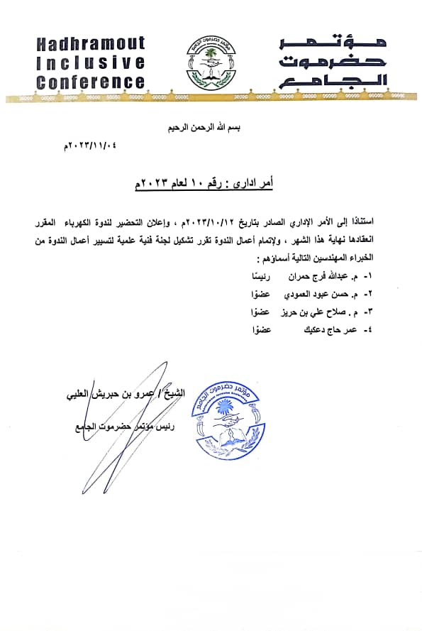 تشكيل لجنة فنية لتسيير ندوة عن الكهرباء في حضرموت