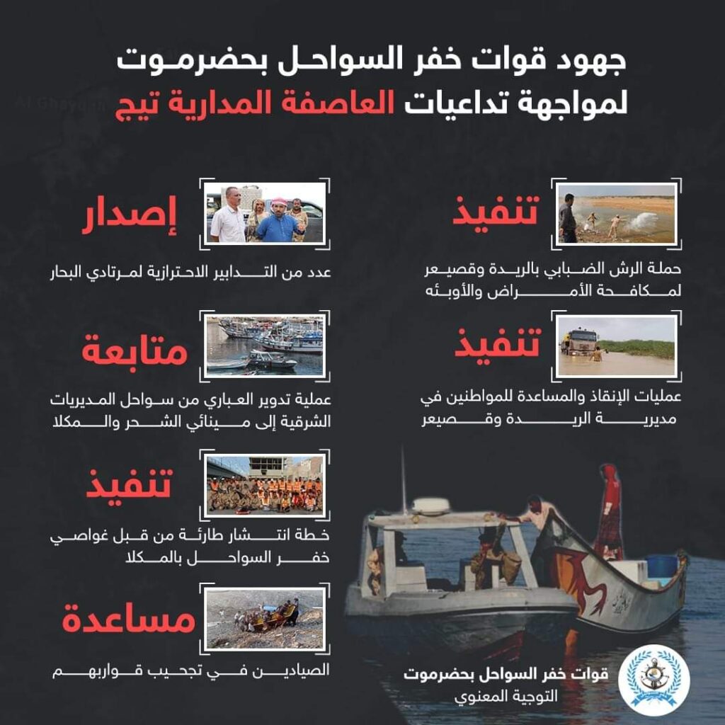 جهود قوات خفر السواحل بحضرموت لمواجهة تداعيات العاصفة المدارية تيج
