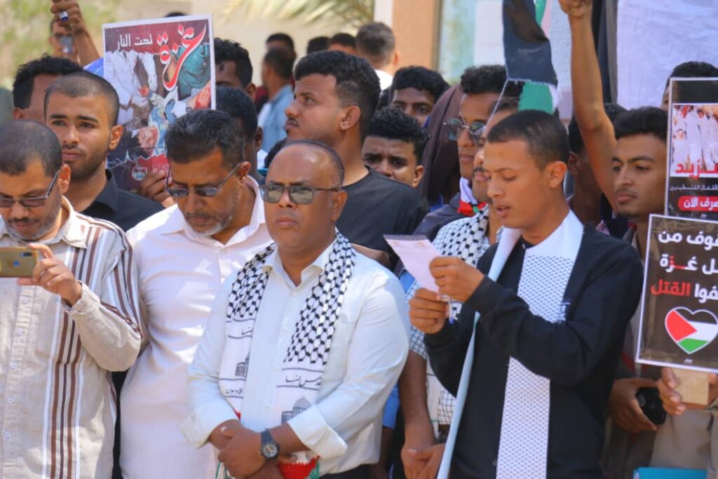 طلاب كلية المجتمع سيئون ينفذون وقفة احتجاجيه للتنديد بجرائم كيان العدو الصهيوني