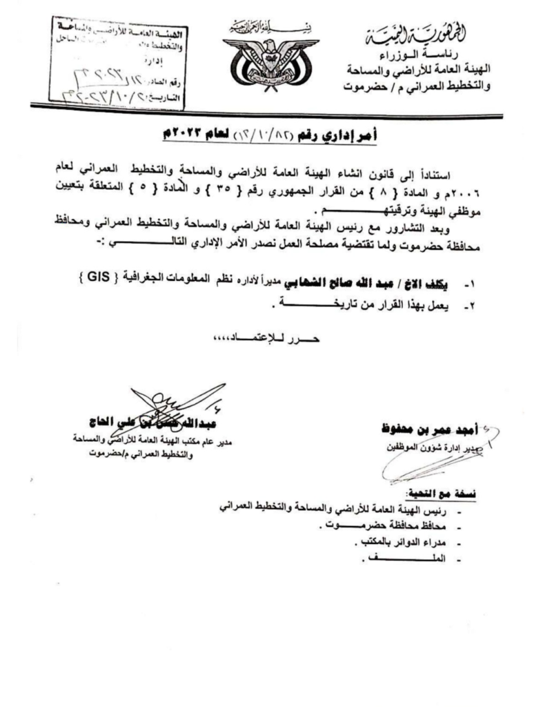 مدير عام مكتب الهيئة العامة للأراضي بمحافظة حضرموت يصدر أمر رقم (١٢/١٠/٨٢) تعرف عليه