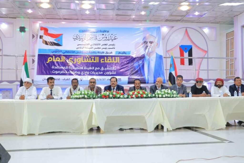 فريق هيئة رئاسة الانتقالي يعقد لقاءً موسعا مع المكونات السياسية ومنظمات المجتمع المدني وقطاعي المرأة والشباب والشخصيات القبلية بوادي وصحراء حضرموت