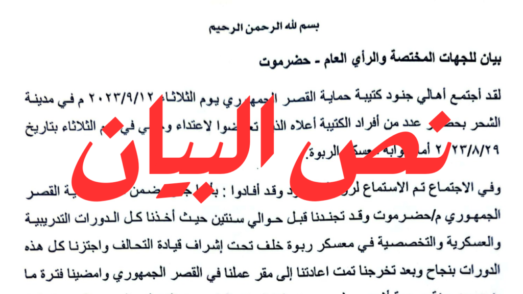أهالي وذوي جنود كتيبة حماية القصر الجمهوري بالمكلا يصدرون بيان للرأي العام