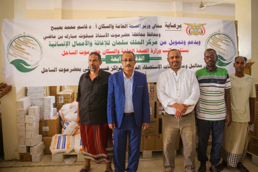 الوكيل بارزيق و الدكتور الجمحي يدشنان استلام كميات من المحاليل ومستلزمات الإستصفاء الدموي لمرضى الكلى الدفعة الرابعة بدعم من مركز الملك سلمان للإغاثة والأعمال الإنسانية بمحازن الدواء بمنطقة جول مسحة بالمكلا