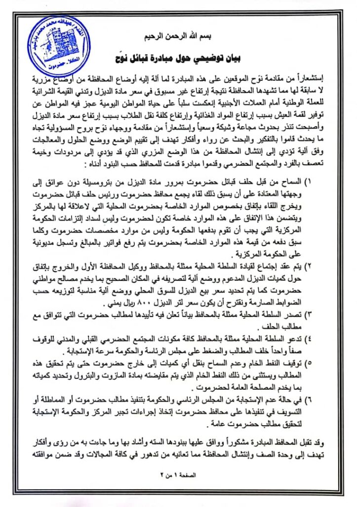قبائل نوَح تصدر توضيحًا حول مبادرتها لمعالجة أزمة الديزل في حضرموت وتؤكد رفض المحافظ استلام رد الحلف
